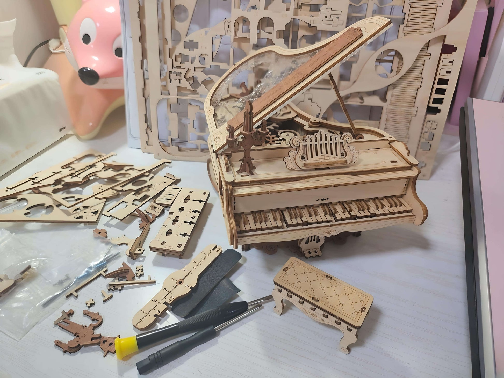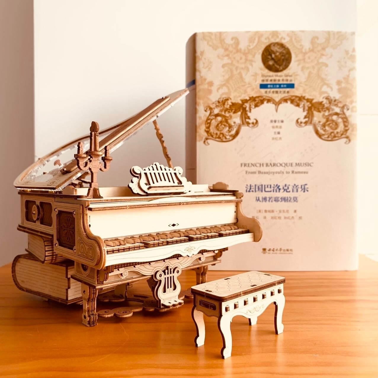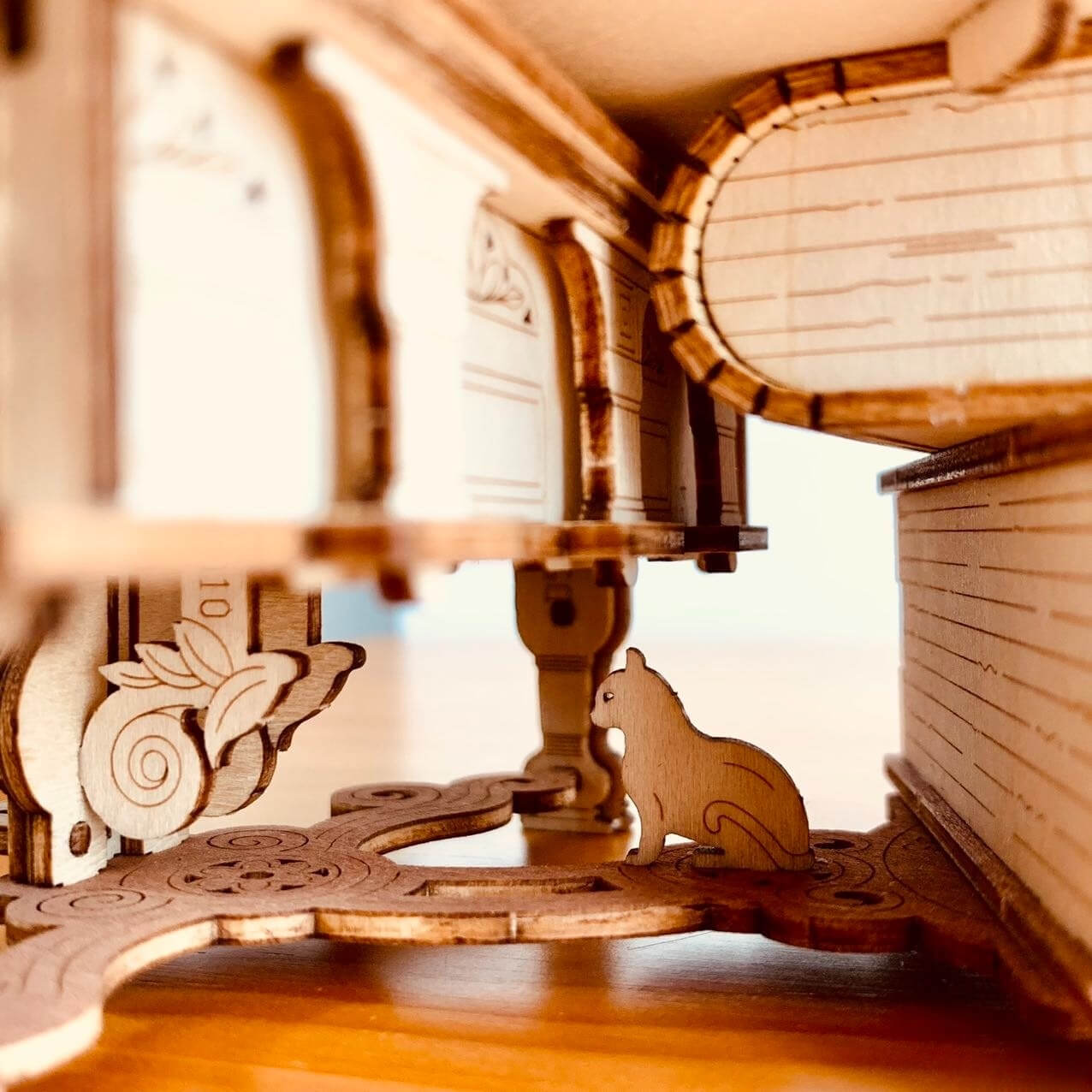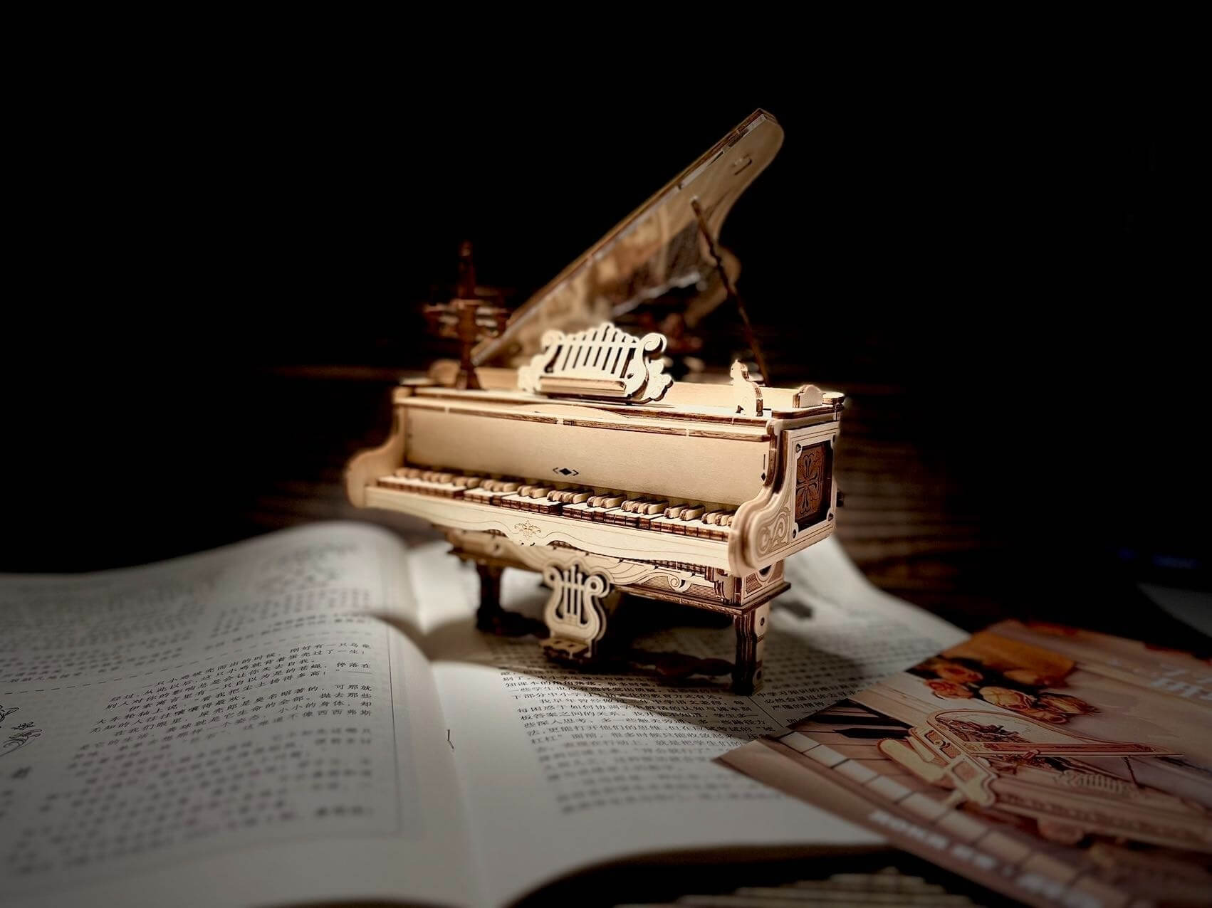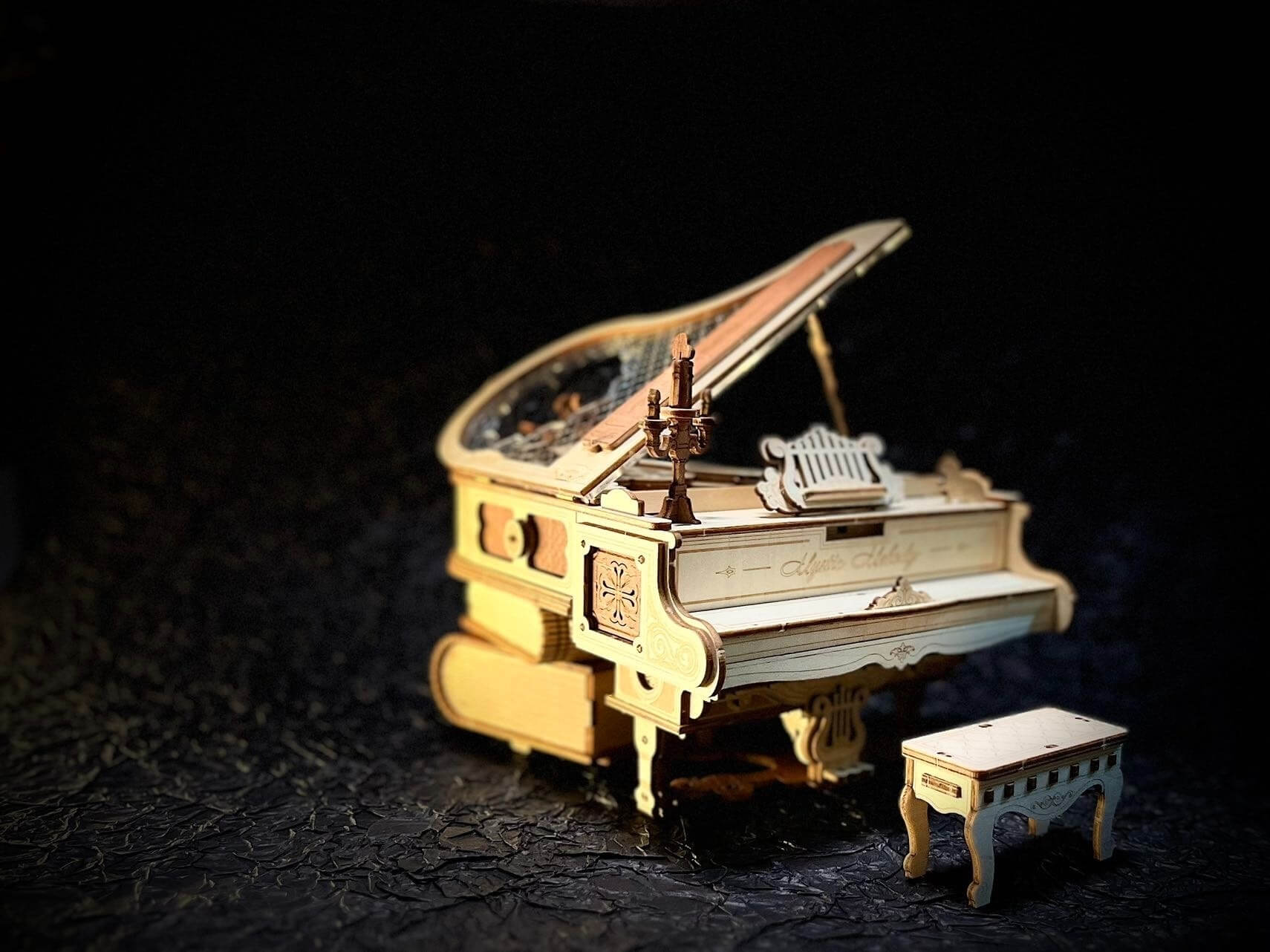 Hidden inside the body, the precision mechanics drive the keys to play on their own, simulating the way a piano plays. The winding movement is twisted, and the gear drive model propels the keys, creating a mesmerizing self-playing piano experience. Once fully assembled, a simple winding of the key sets the gears in motion, creating a symphony of interlocking mechanisms as the music begins to play.