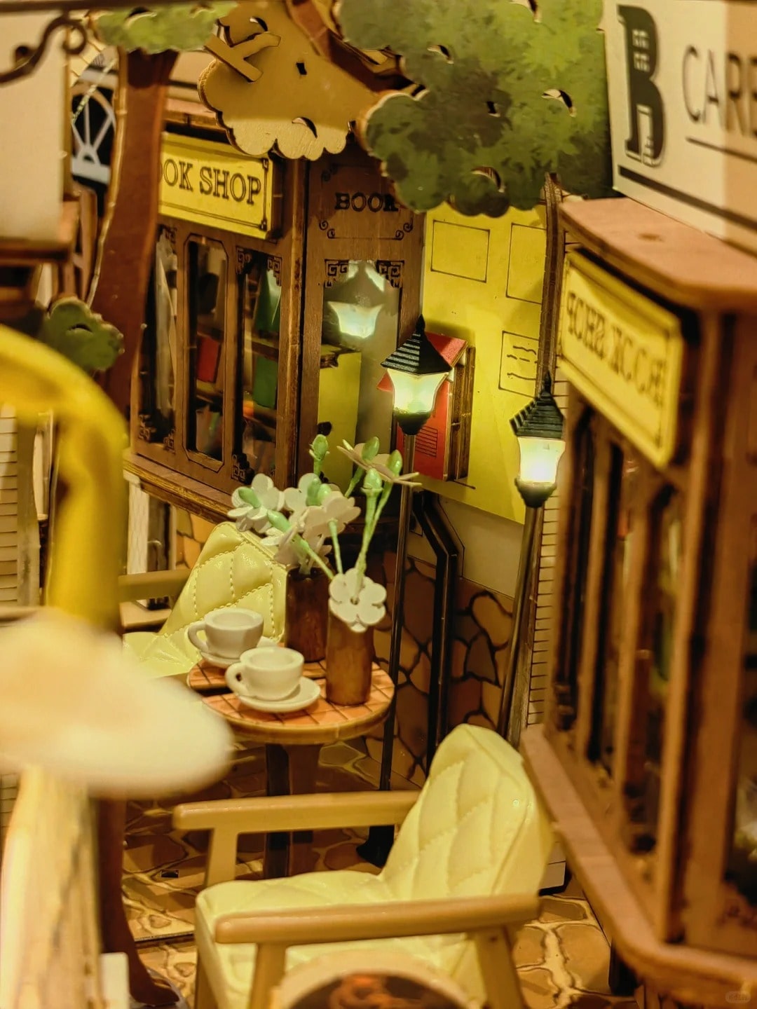 Stimulate the nostalgia of book shopping with the design of this kit, enhancing the aesthetic appeal of any space. The elegant transparent roof provides a clear view of the inside arrangement, while the cozy sip nook lends an air of leisure to the scene.